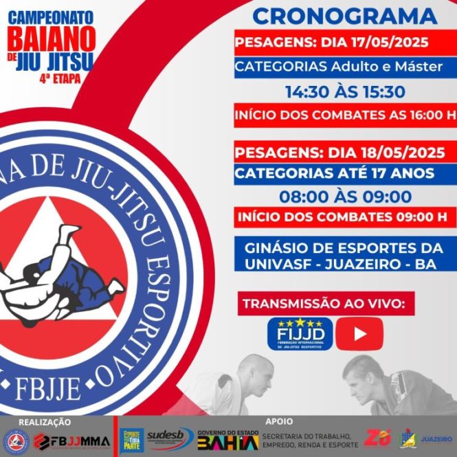Cerca de 500 atletas de jiu-jitsu e parajiujitsu desembarcam em Juazeiro neste sábado, 17, prontos para encarar os tatames a partir das 14h30. Os esportistas vêm da capital e do interior de todo o estado da Bahia para participar da quarta etapa do Campeonato Baiano de Jiu-Jitsu 2025. O evento acontecerá no ginásio de esportes da Universidade Federal do Vale do São Francisco (Univasf).